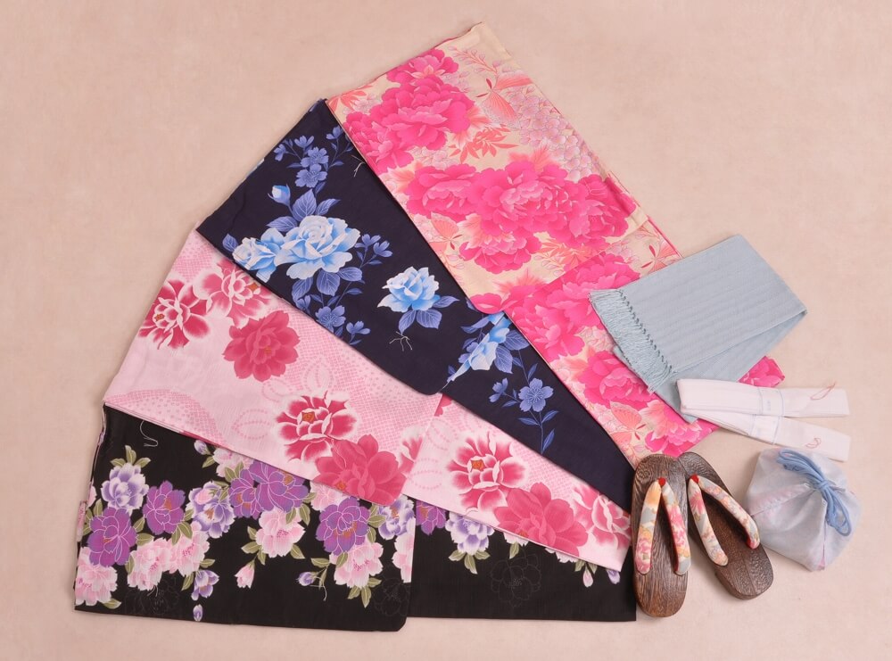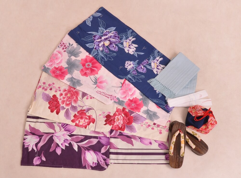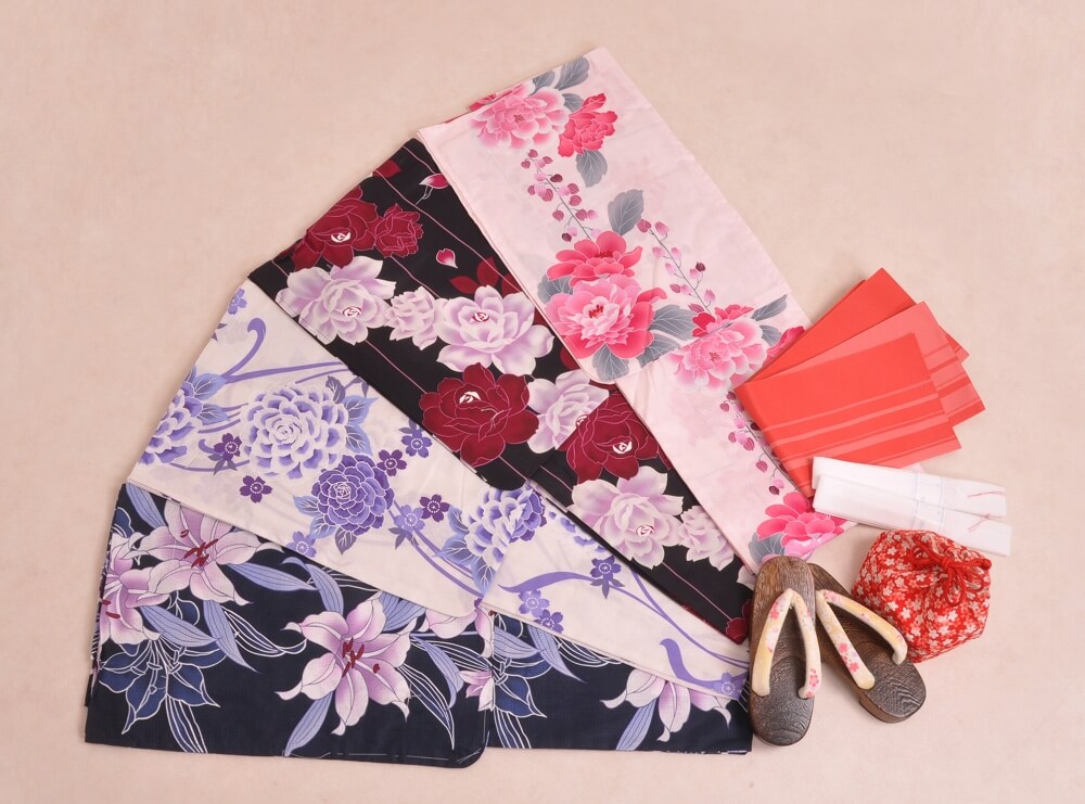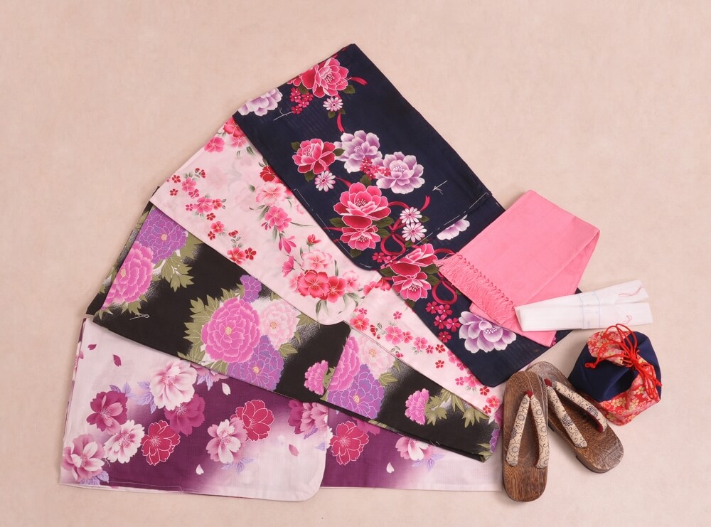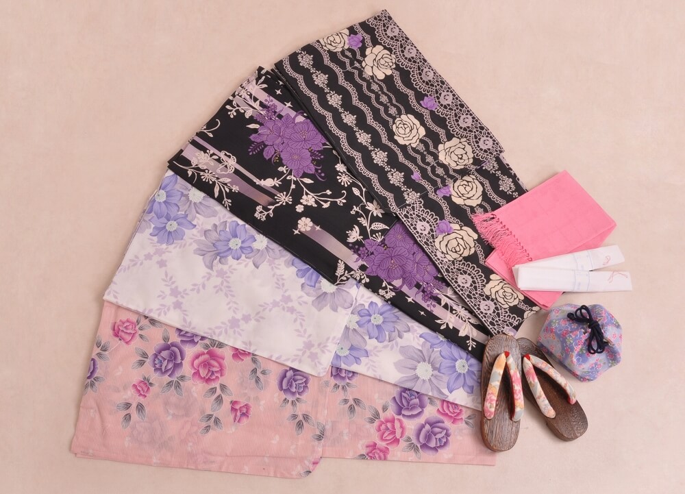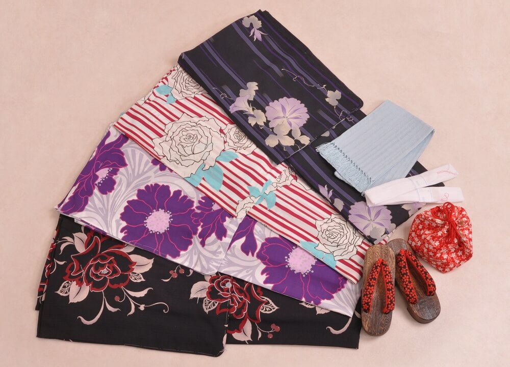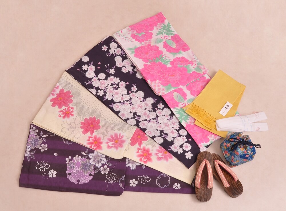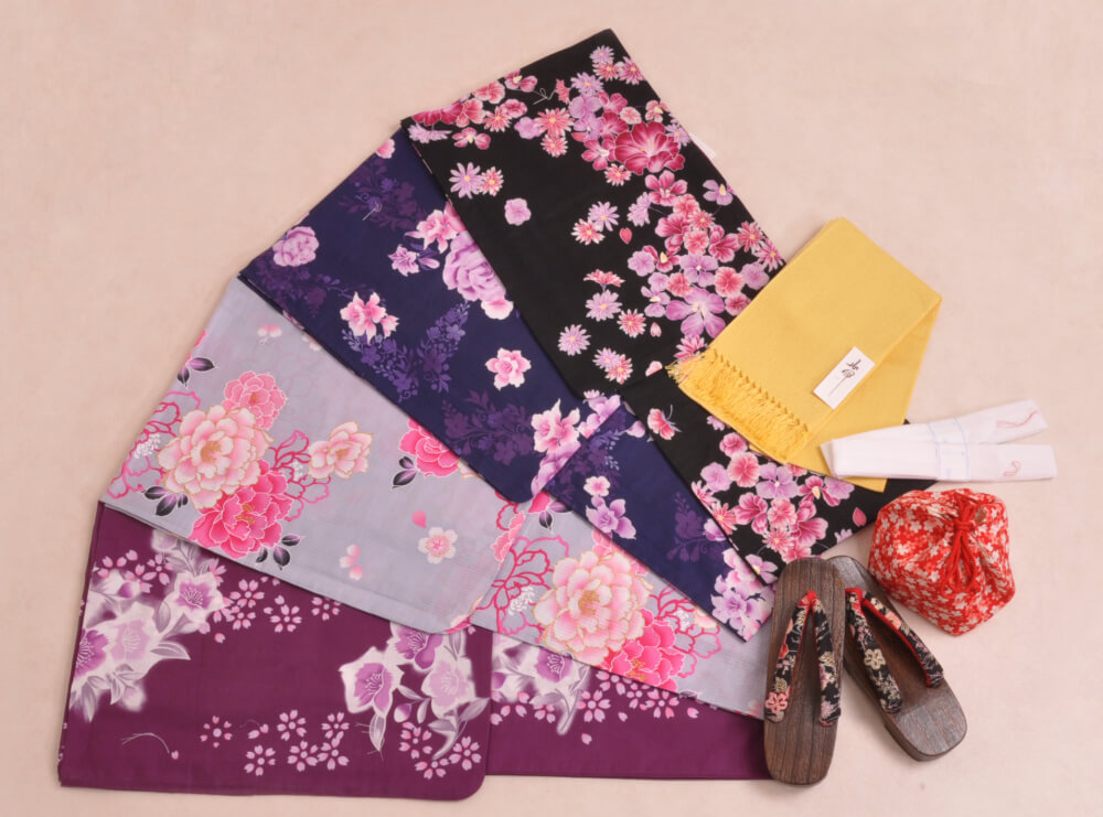 浴衣、帯、かばん、下駄、腰帯の5 点セットで購入頂きます。(浴衣により料金が異なります)