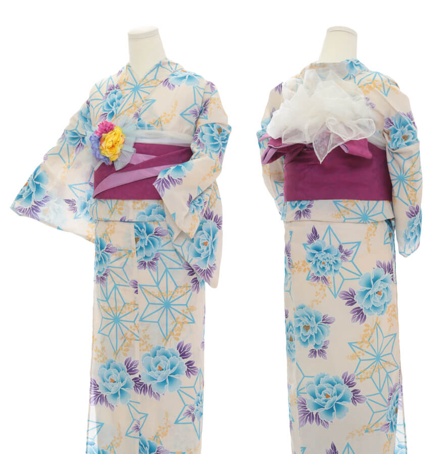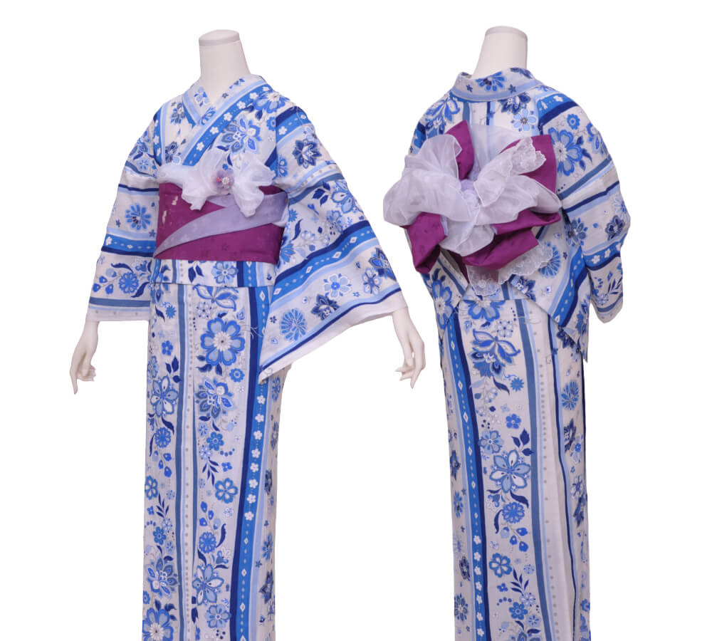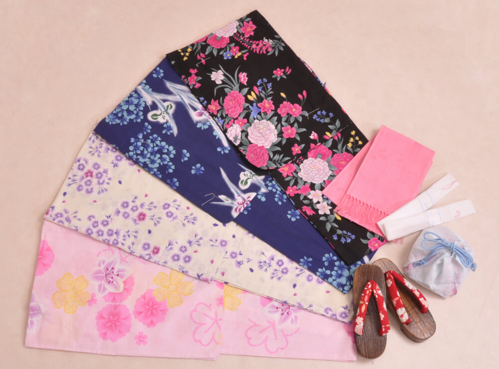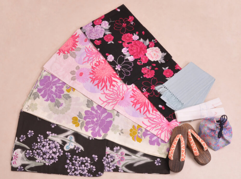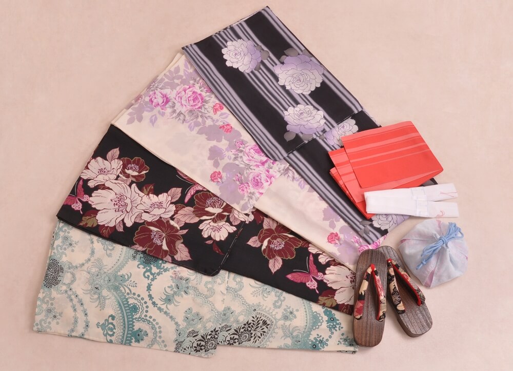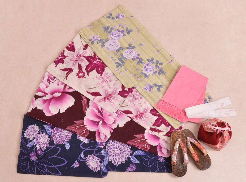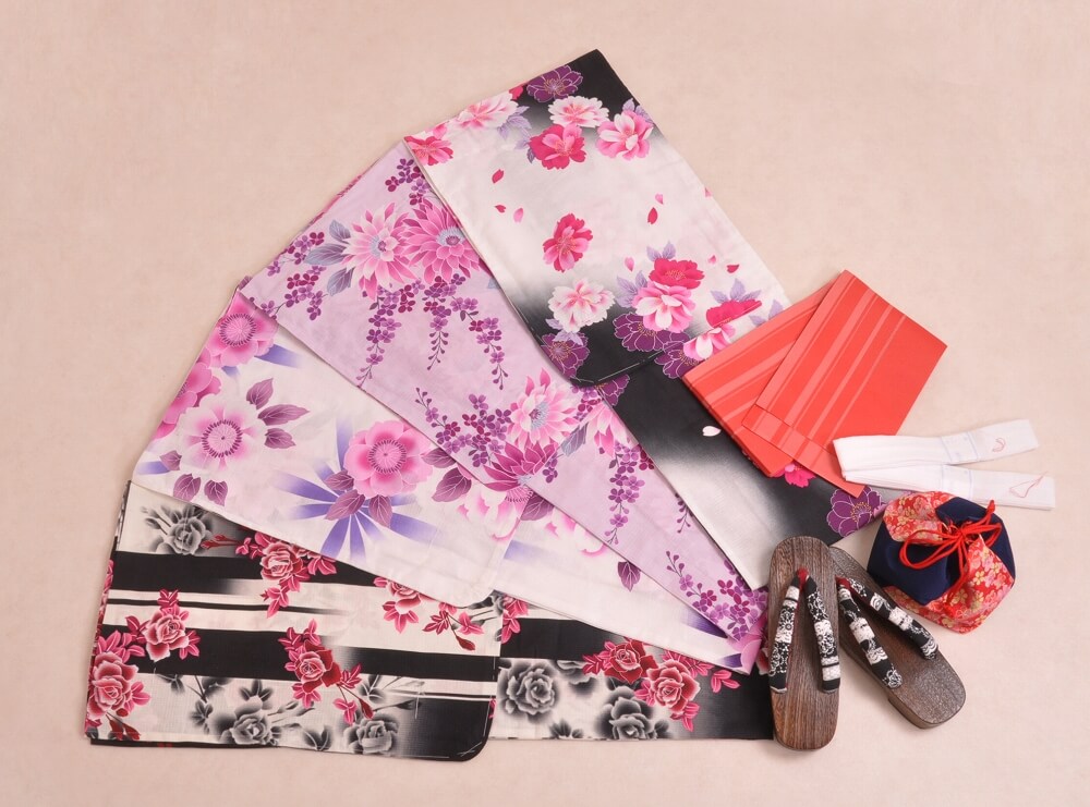 浴衣、帯、かばん、下駄、腰帯の5 点セットで購入頂きます。(浴衣により料金が異なります)