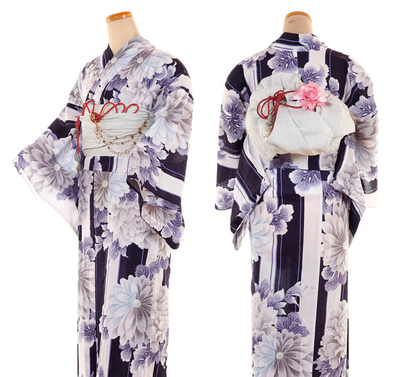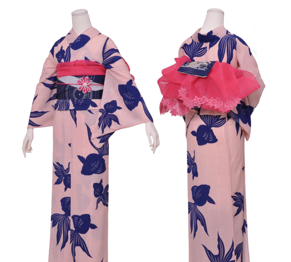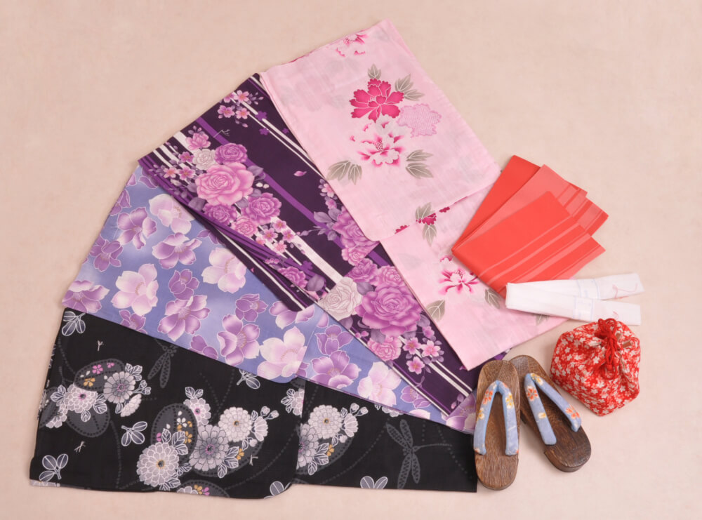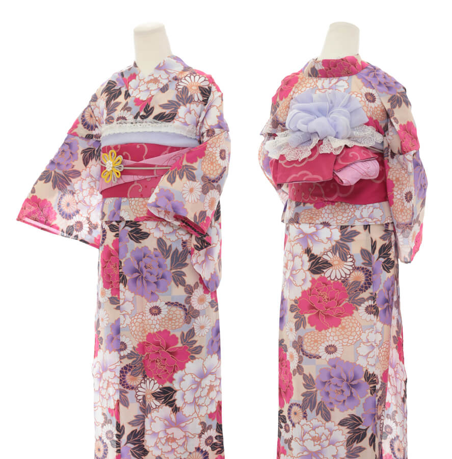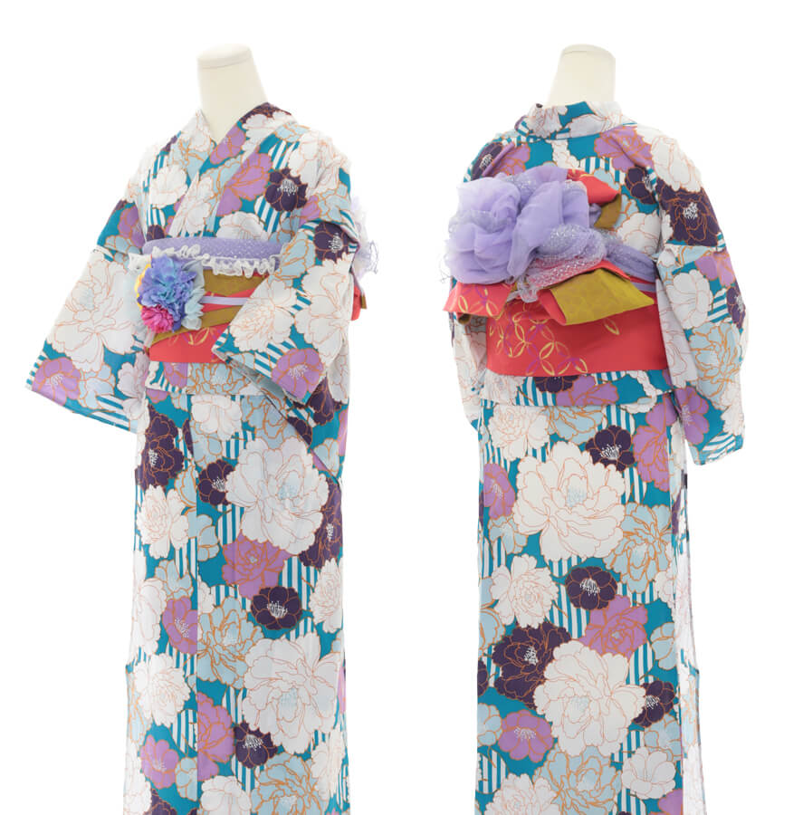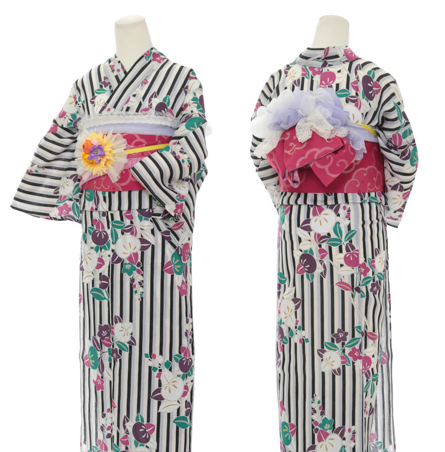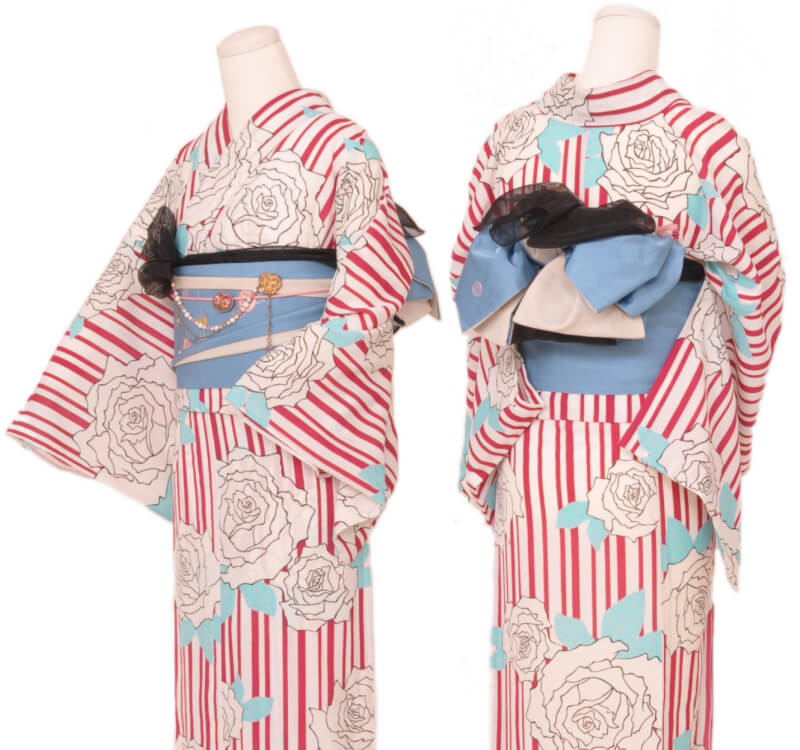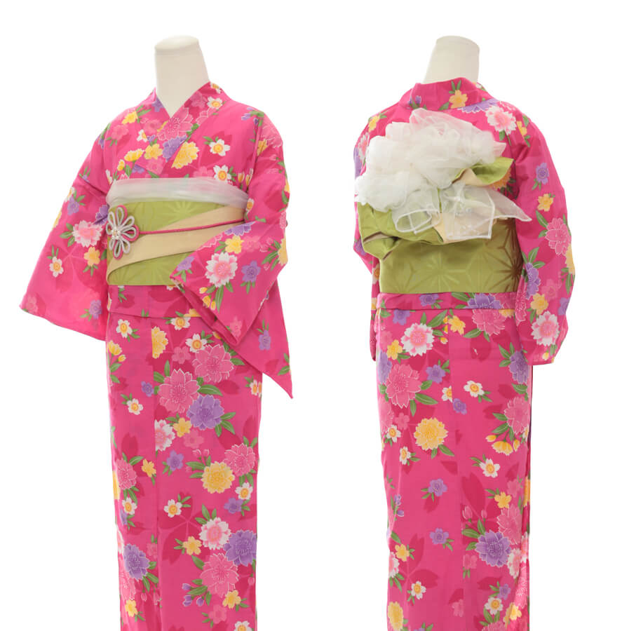 浴衣、帯、かばん、下駄、腰帯の5 点セットで購入頂きます。(浴衣により料金が異なります)