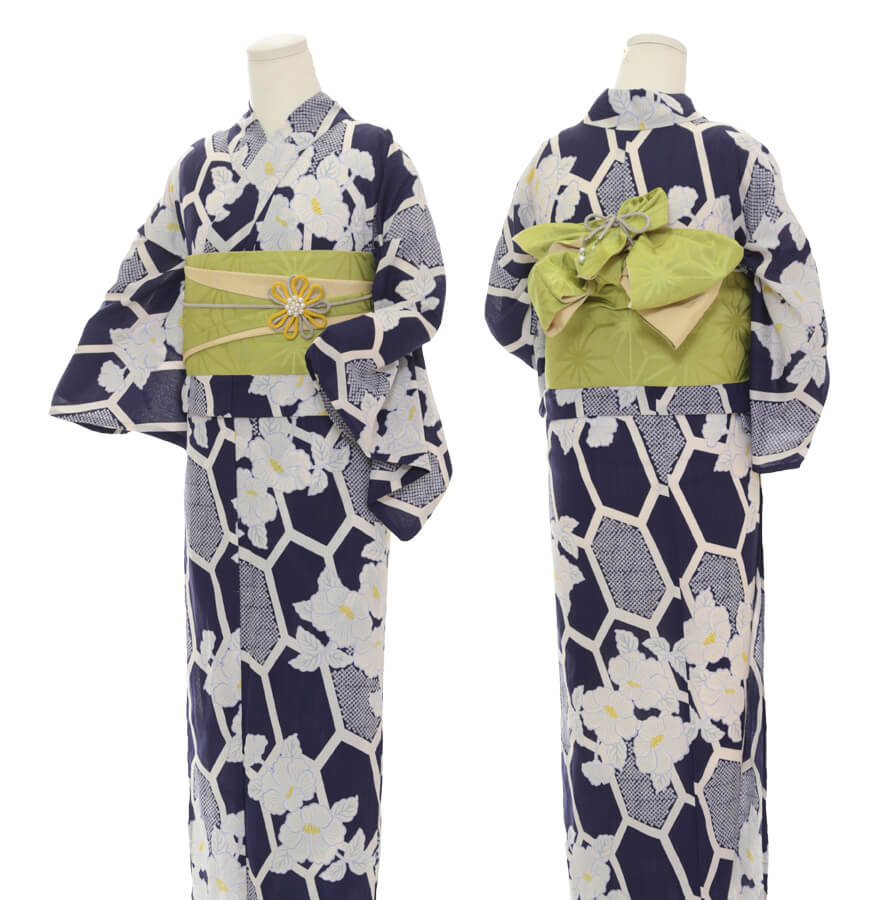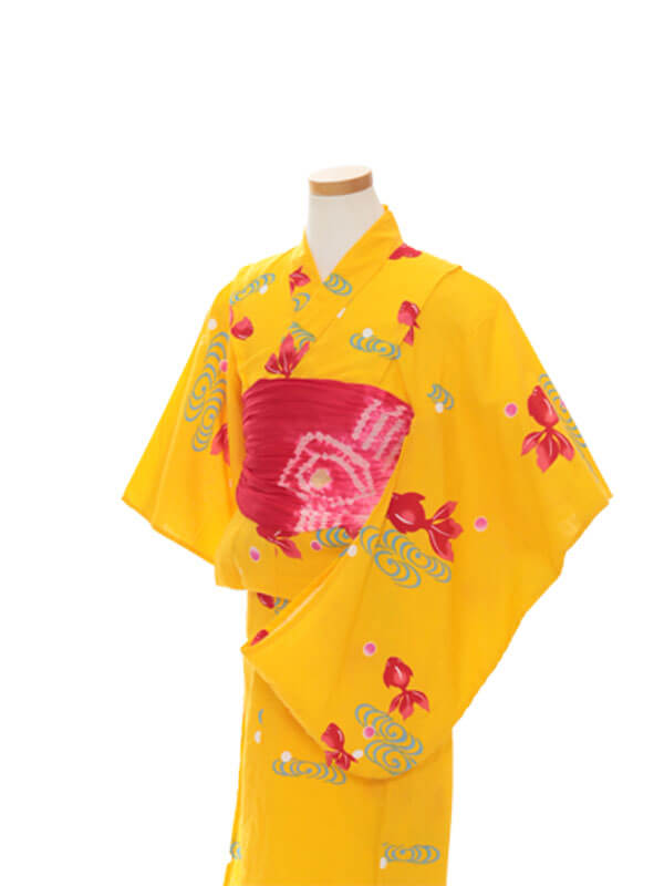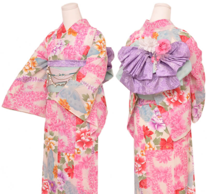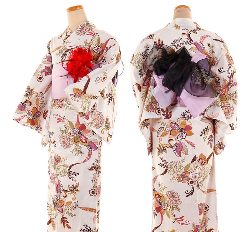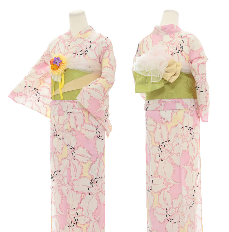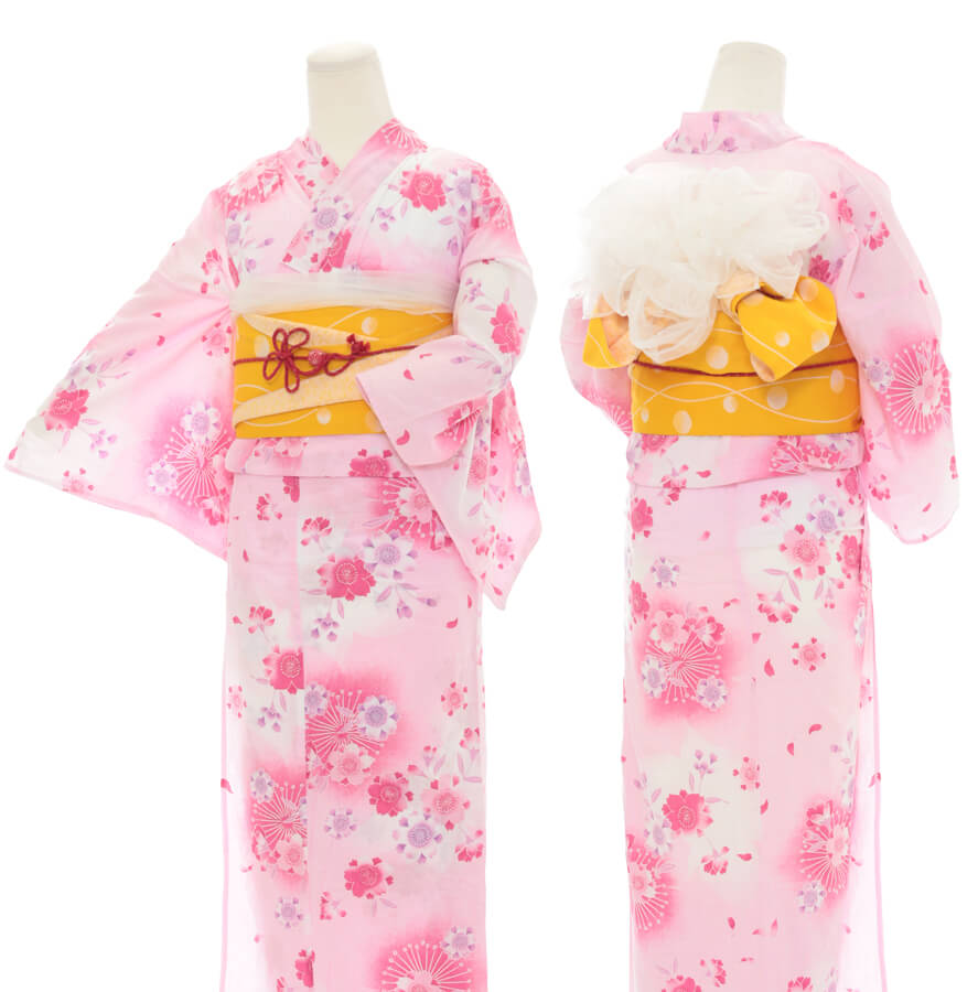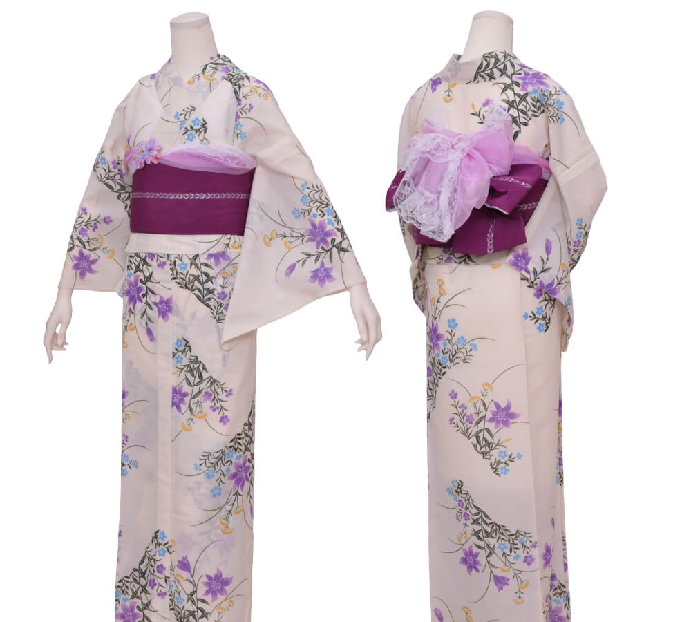 浴衣、帯、かばん、下駄、腰帯の5 点セットで購入頂きます。(浴衣により料金が異なります)