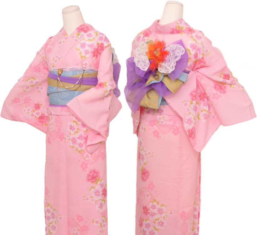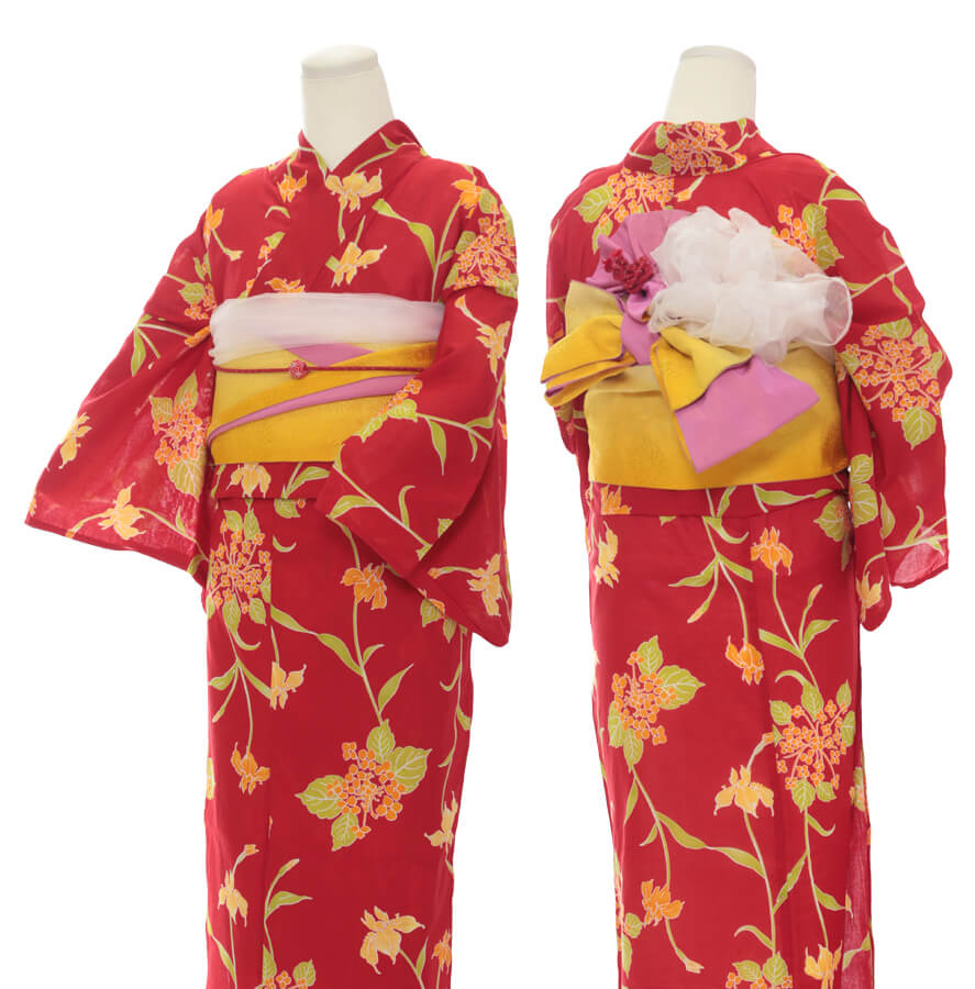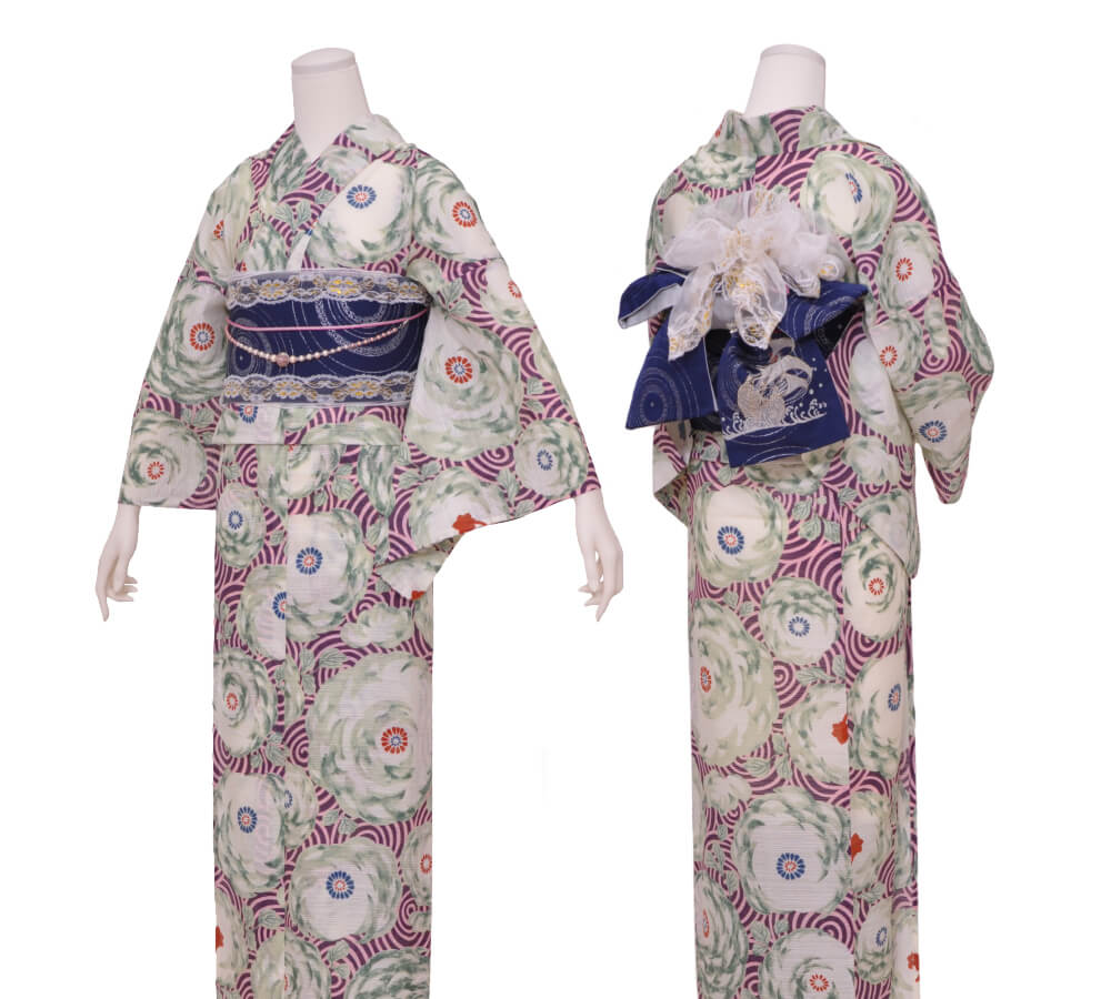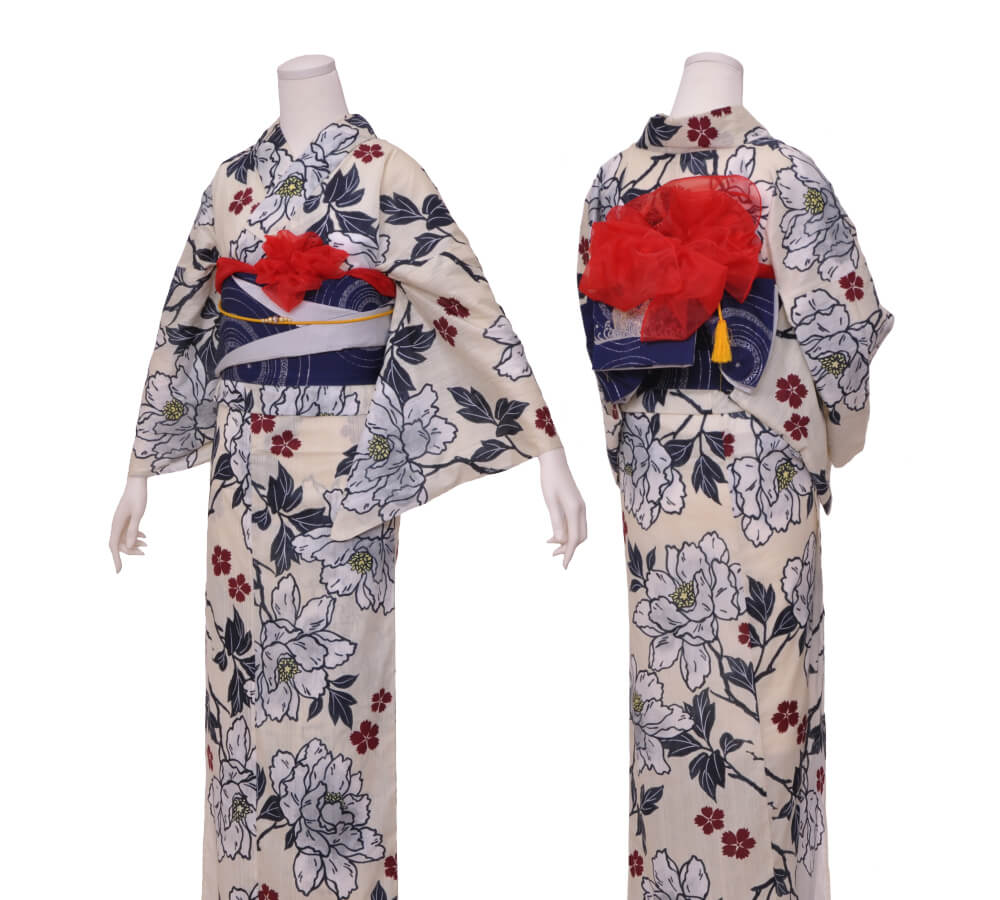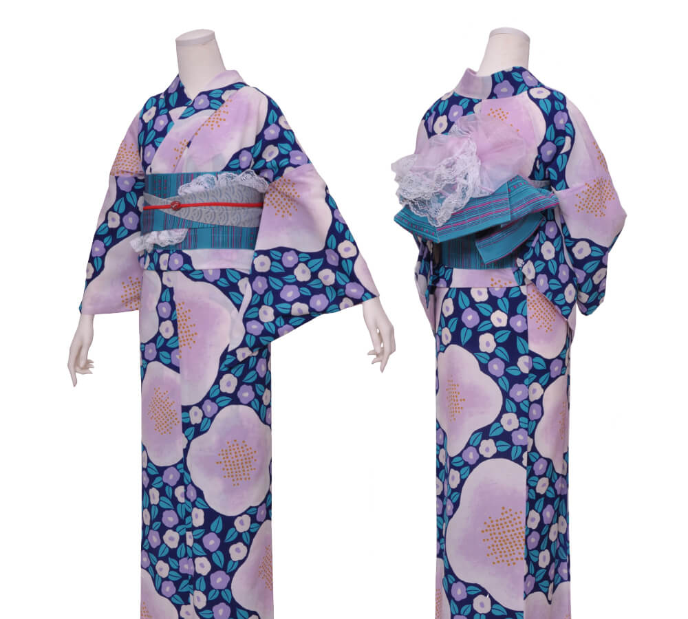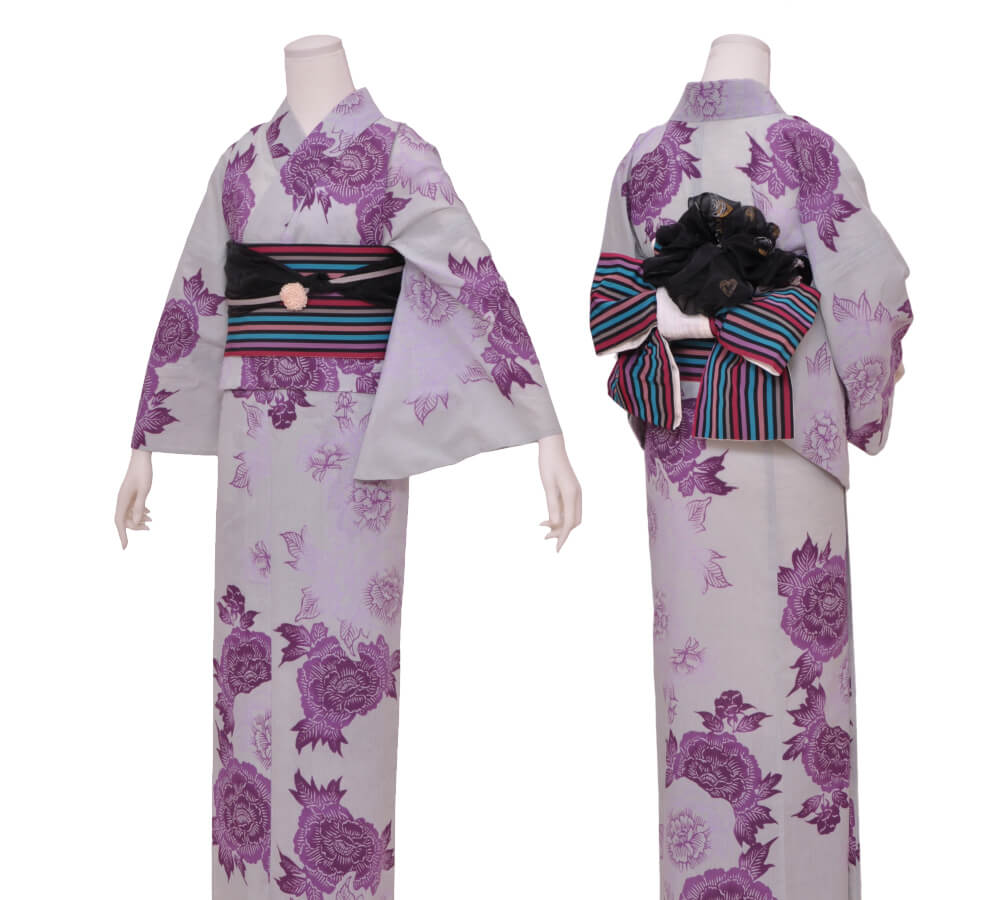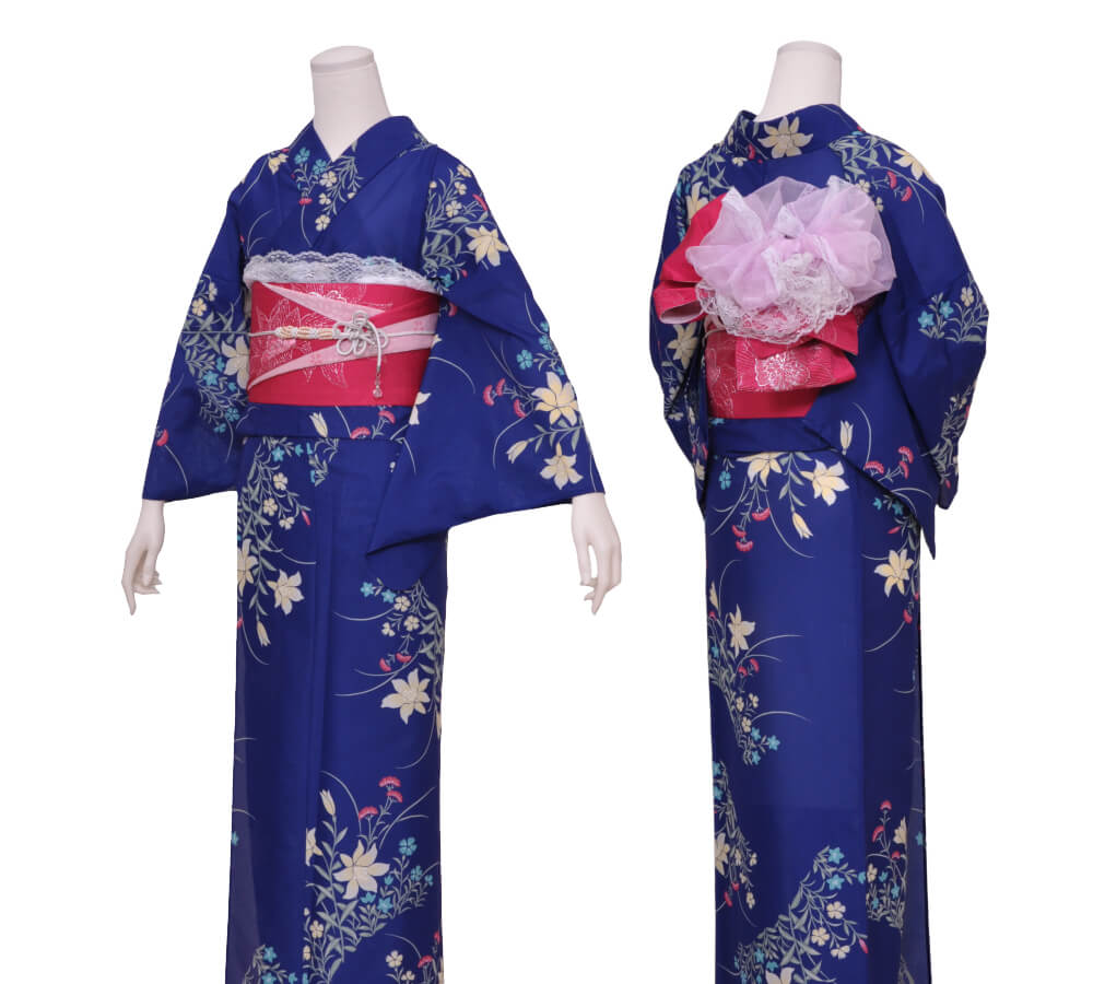 浴衣、帯、かばん、下駄、腰帯の5 点セットで購入頂きます。(浴衣により料金が異なります)