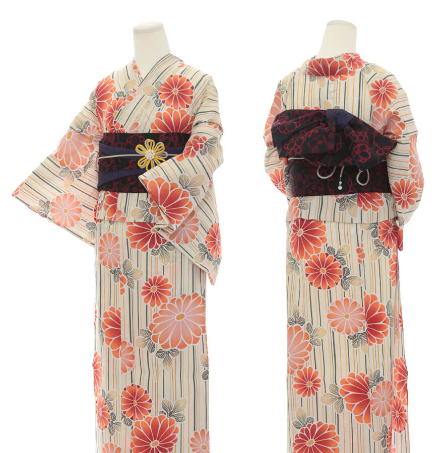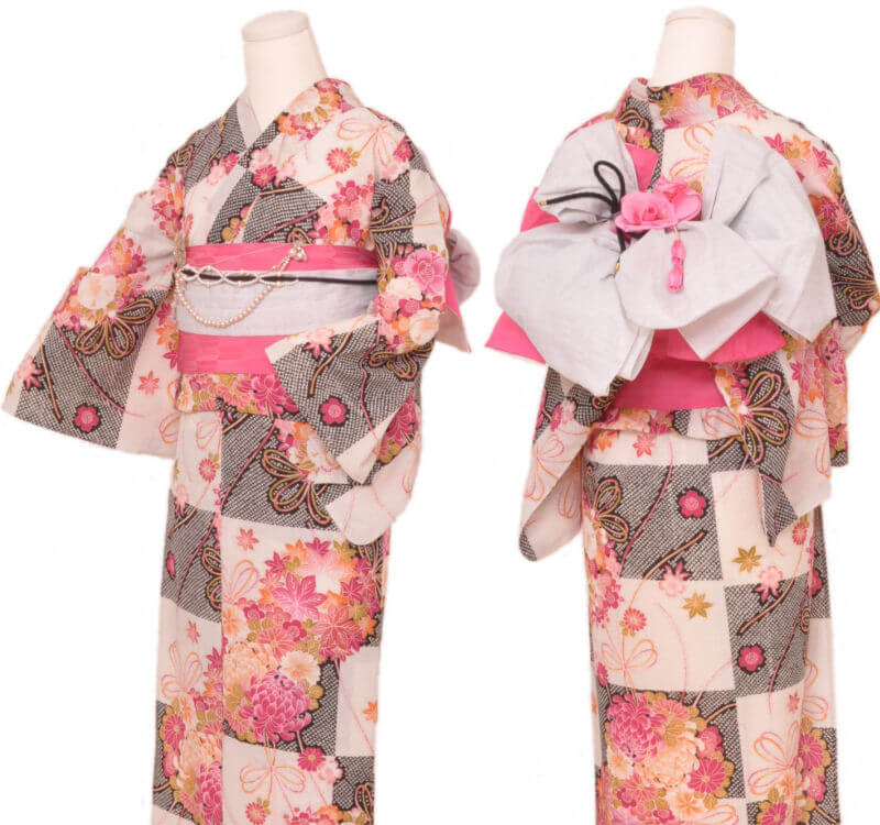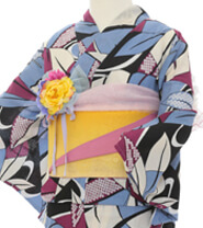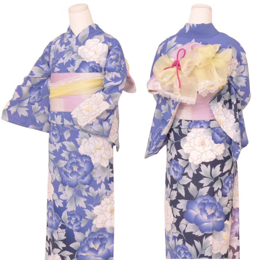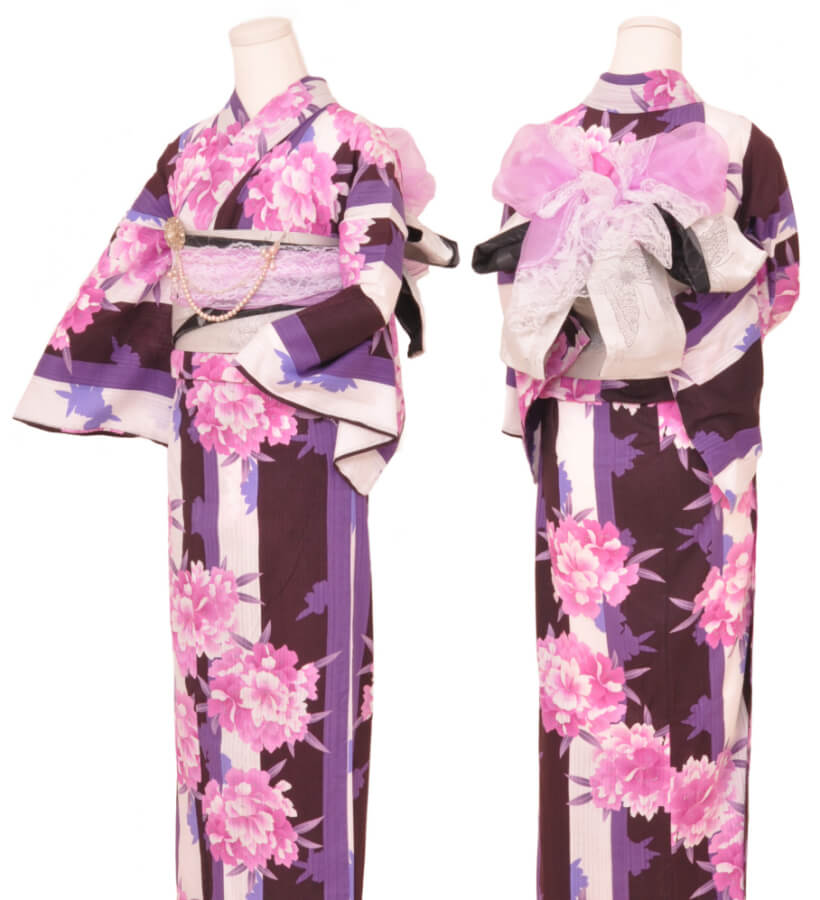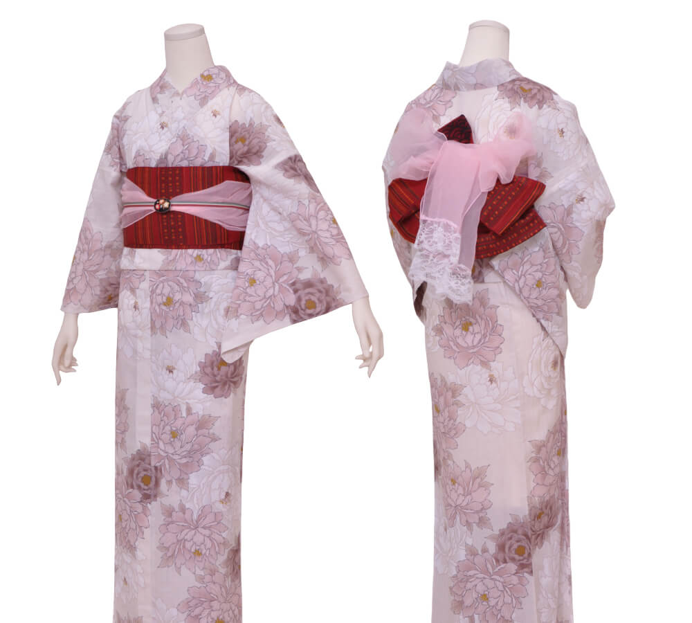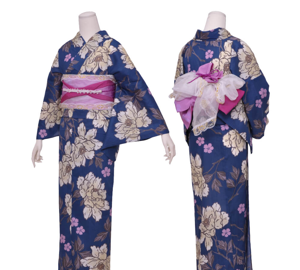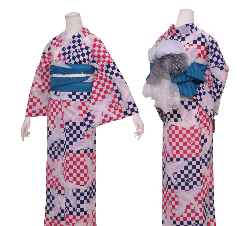 浴衣、帯、かばん、下駄、腰帯の5 点セットで購入頂きます。(浴衣により料金が異なります)
