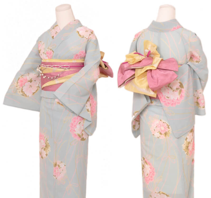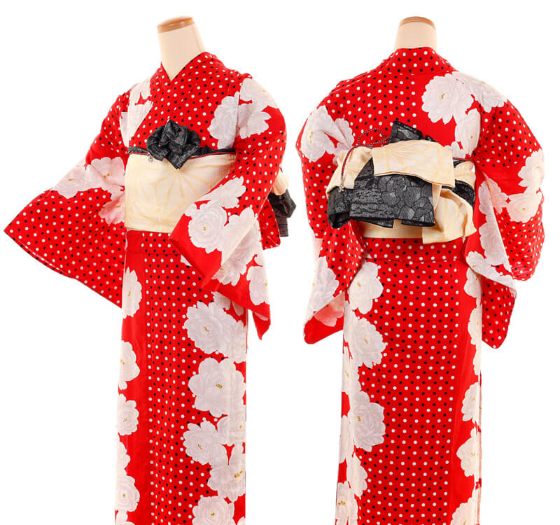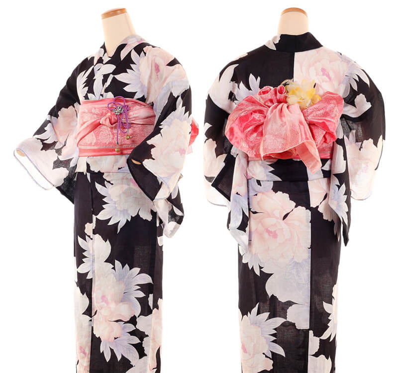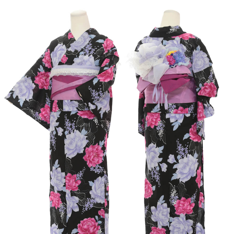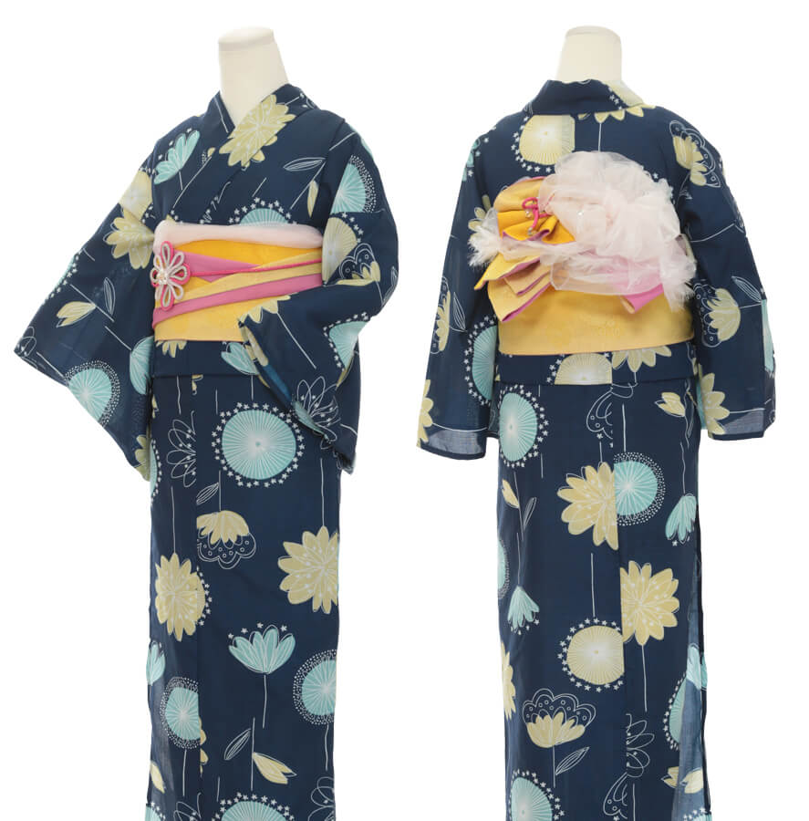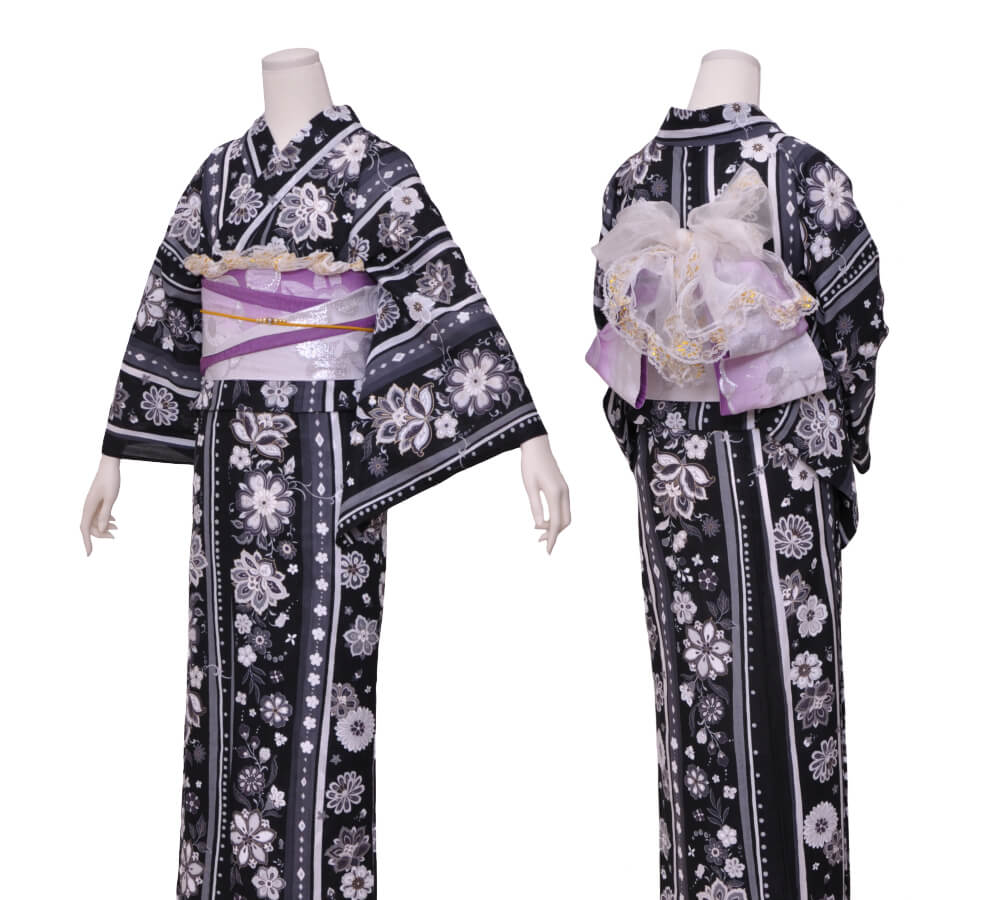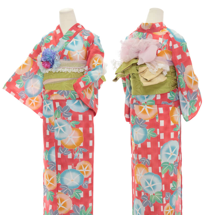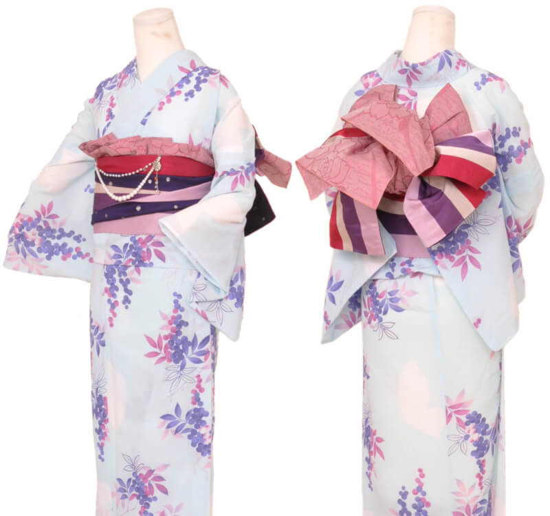 浴衣、帯、かばん、下駄、腰帯の5 点セットで購入頂きます。(浴衣により料金が異なります)