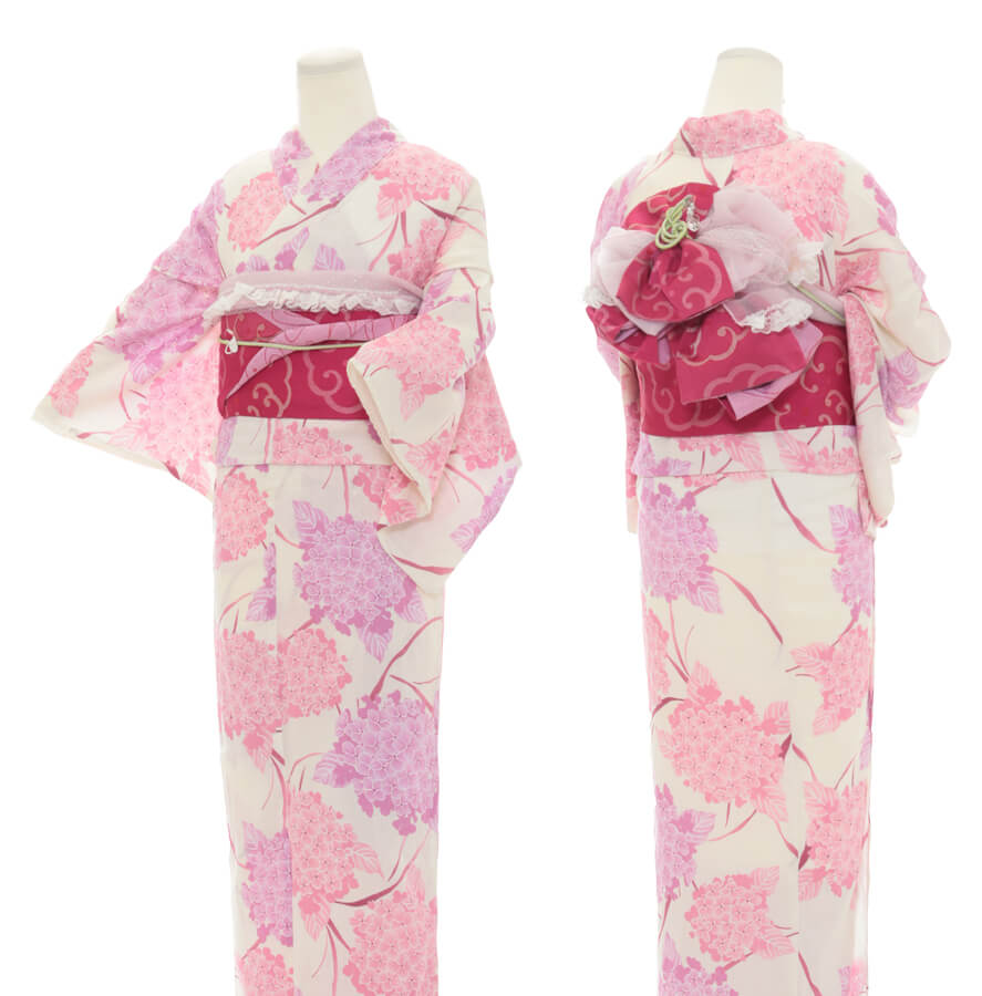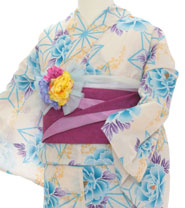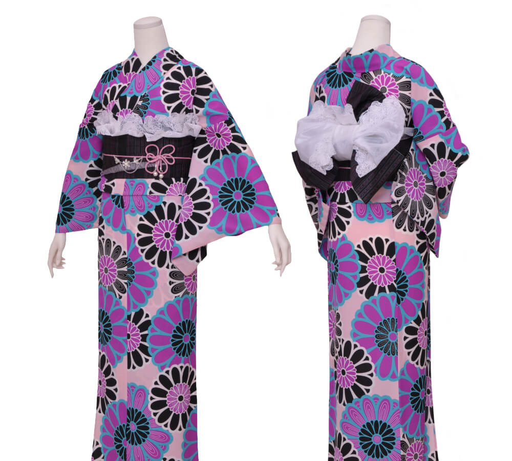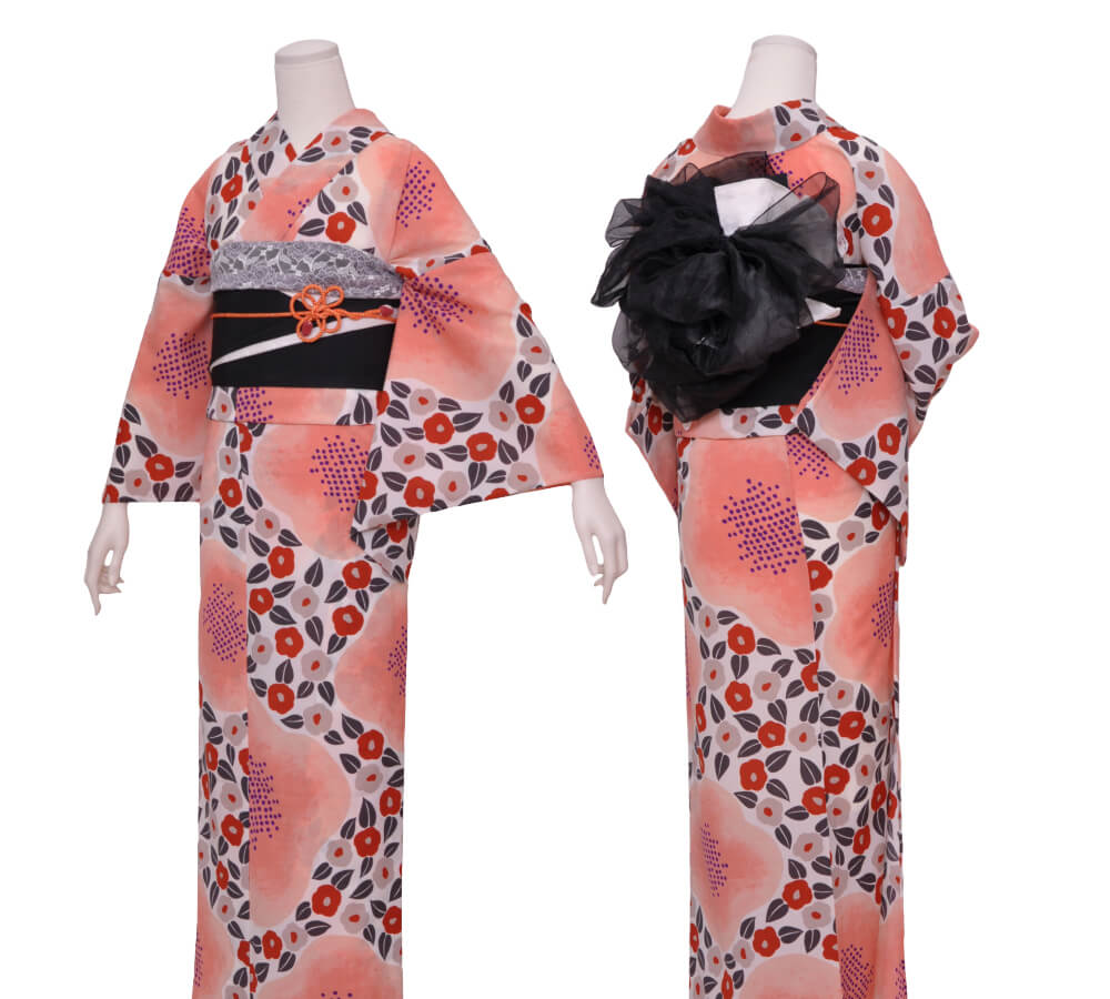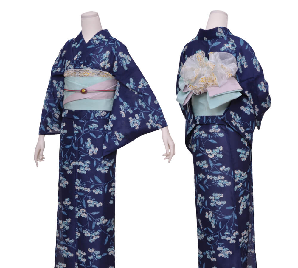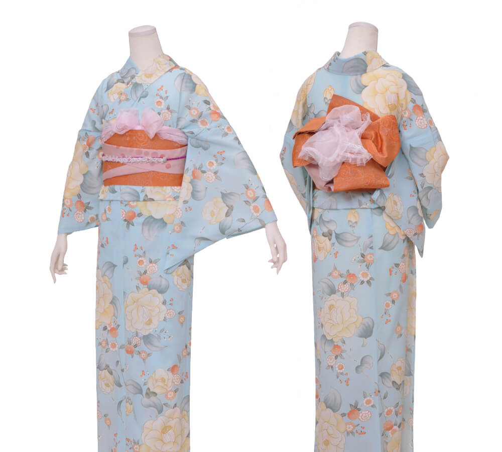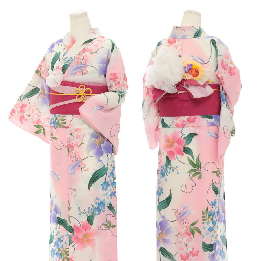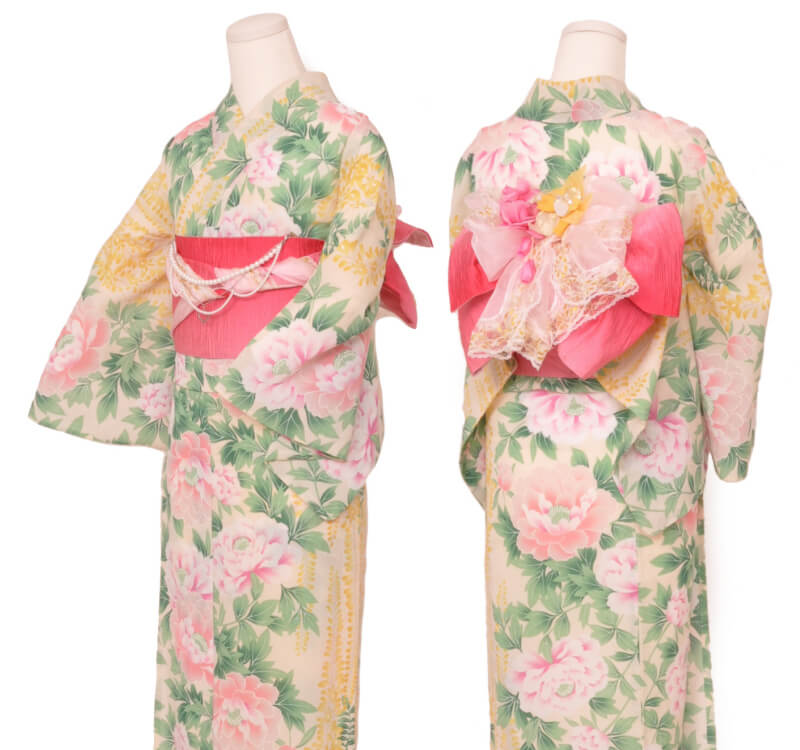 浴衣、帯、かばん、下駄、腰帯の5 点セットで購入頂きます。(浴衣により料金が異なります)