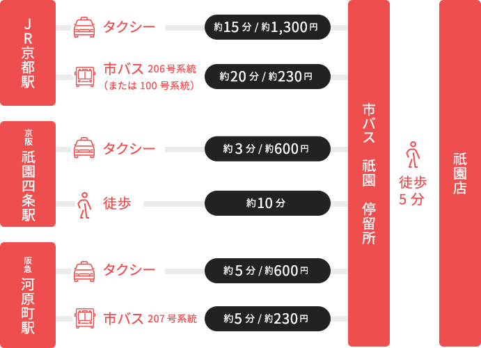 に乗車、「祇園」で下車。徒歩5分 - 徒歩15分。